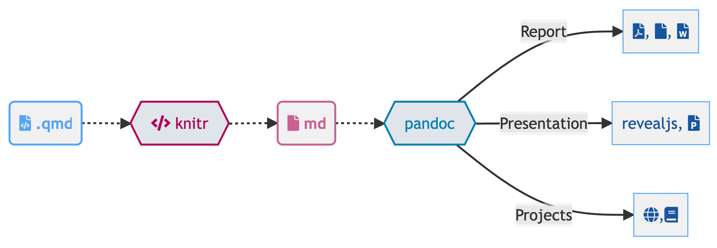Es una interfase en línea de comandos (CLI, por sus siglas en inglés) que renderiza textos en formato plano (.qmd, .rmd, .md) ó mixtos (.ipynb/Jupyter notebook) a visuales.